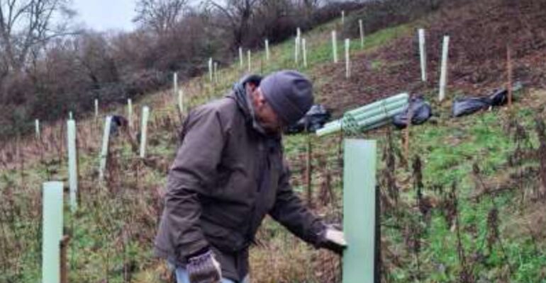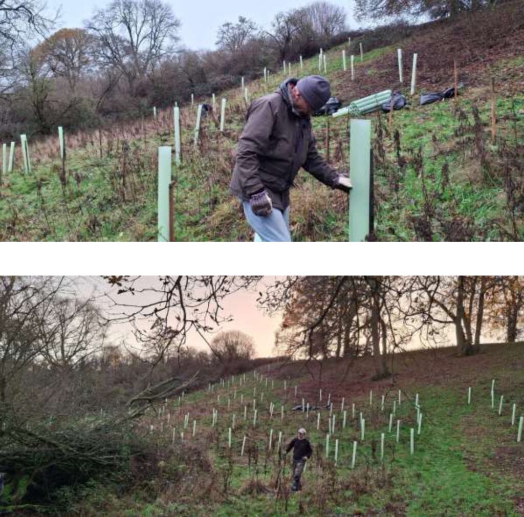 On the afternoon of Thursday 4th December, Mike McCarthy and John Dinnie assisted Matt Byrne (SRT) with the 1st phase of the tree planting at Church Farm, on the Sutton under Brailes side of Brailes Hill. On the day, the SAFAG pair’s contribution was 55 whips, a mixture of oak, silver birch, hazel and hawthorn. The same intrepid duo returned on Monday morning of the following week to help Matt Bryne with the next phase, now joined by SRT colleague Imogen Rutter. SAFAG’s contribution on this second day was 100 plus mixed whips. The main block of planting has now been completed, with Matt Byrne and Imogen Rutter left to work on a new uphill planting block.